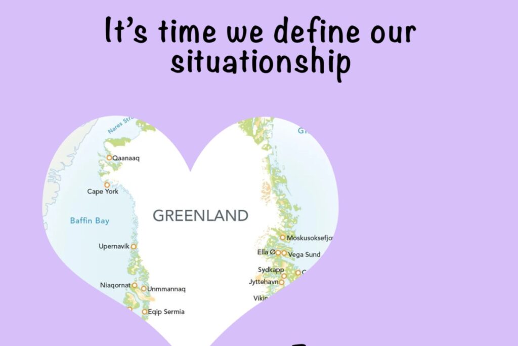 «Пришло время нам определиться с нашей ситуацией с отношениями», — говорится на изображении Гренландии, обведенной силуэтом сердца.