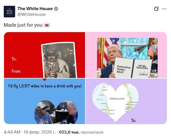 фото: x.com/WhiteHouseБелый дом в честь Дня всех влюбленных опубликовал серию валентинок, упомянув, в том числе, Гренландию и операцию в Венесуэле.