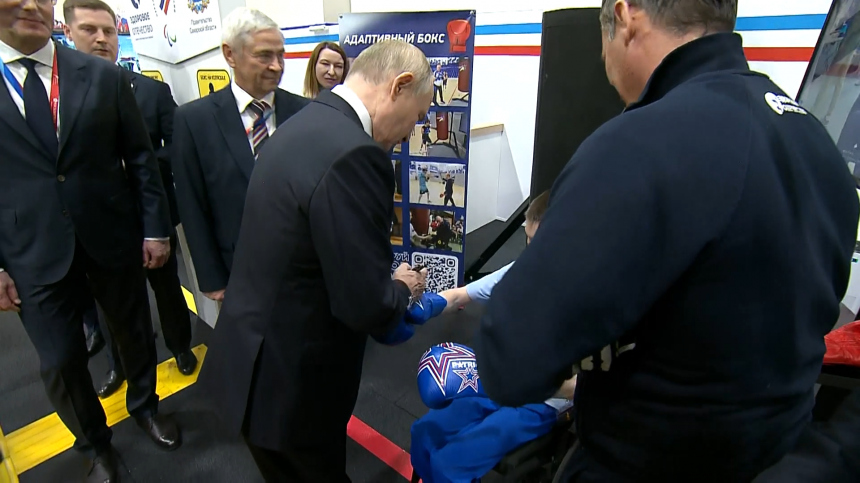 Президент России Владимир Путин подписал боксерские перчатки юному спортсмену. Глава государства встретился с подростком в ходе посещения демонстрационно-просветительского центра по адаптивному спорту в Самаре.