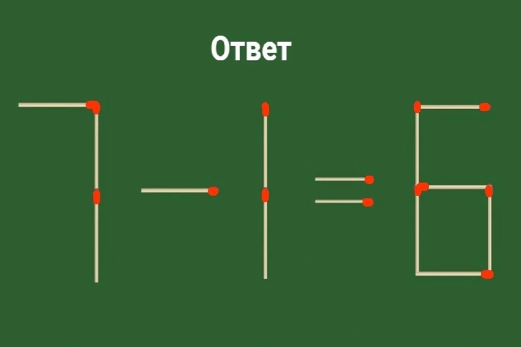Нашли? Ответ простой: неправильная спичка лежит на знаке «плюс». Перекладываете ее на цифру пять — и получается 7 — 1 = 6. Если уложились в 20 секунд, считайте, что ваш мозг официально проснулся!