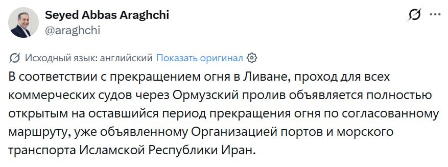 Министр иностранных дел Ирана Аббас Аракчи заявил, что страна открыла Ормузский пролив на время прекращения огня.