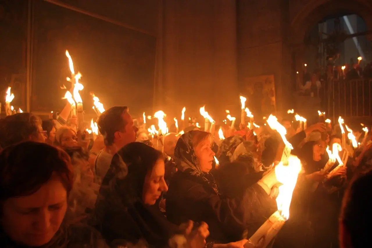 Иерусалимский патриарх заходит внутрь для глубокой молитвы лишь после строгого досмотра на предмет отсутствия спичек. Вскоре он выносит верующим 33 горящие свечи — именно столько земных лет прожил Спаситель.