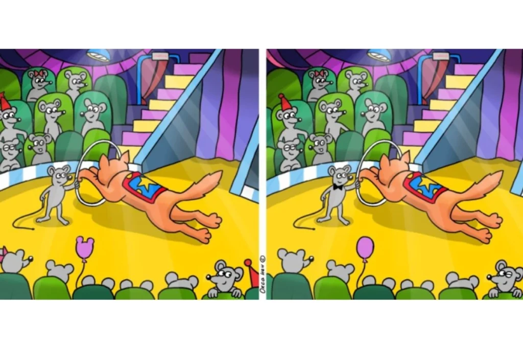 Но на этих рисунках от ИА Nord-News, где нужно найти 10 отличий, возможно все. Художник дал волю фантазии и показал, как мыши дрессируют кота. На арене цирка кот прыгает через обруч, который держит мышь. В зрительном зале довольные мыши — пришли посмотреть на такое шоу.