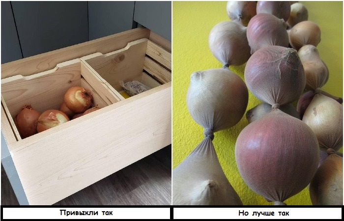 Несмотря на то, что этим лайфхаком пользовались еще наши мамы и бабушки, он до сих пор остается актуальным. А все потому, что лук должен дышать в процессе хранения. Если положить его в ящик, мягкие чешуйки со временем начнут подгнивать из-за нехватки воздуха и большим уровнем влажности в замкнутом пространстве. В колготках же овощ будет долгое время оставаться свежим. Благодаря их текстуре получится сохранить идеальный баланс влаги и температуре, так как капрон хорошо вентилируется.