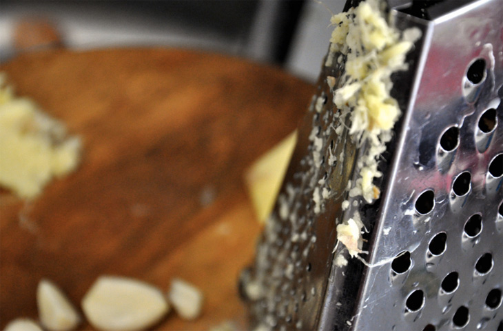 Измельчить чеснок можно разными способами, но то ли из-за нежелания с ним возиться, то ли по привычке обычно он оправляется на доску и нарезается ножом. Однако в отдельных случаях от ножа лучше отказаться и вместо него взять терку. Тертый чеснок получается более мелкий и пушистый, за счет чего он гармоничнее вплетается в состав блюд, где текстура является ключевым показателем, например, в дрессингах или соусе айоли. Если нужен лишь легкий чесночный оттенок, с зубчиком вообще можно ничего не делать, а лишь надавить на него плоской стороной ножа. Добавьте раздавленный зубчик в масло и дайте ему вобрать в себя все ароматы.