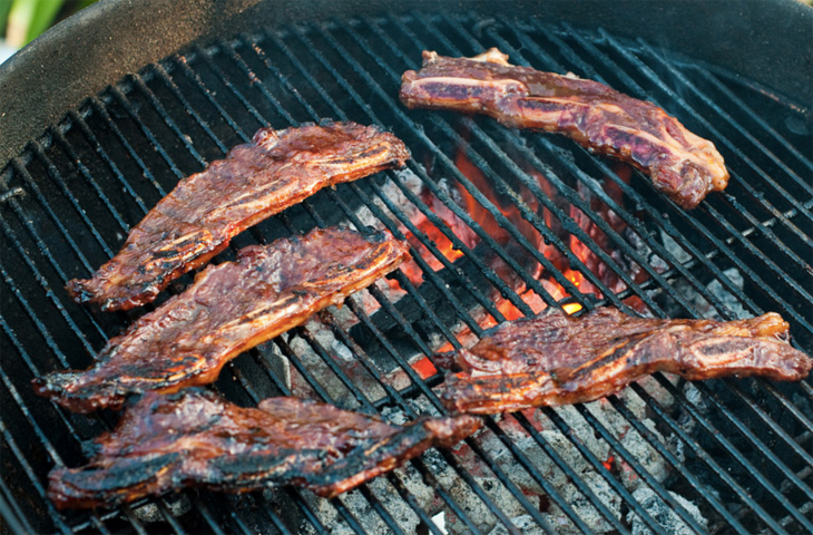 Разогреть гриль или сковроду-гриль; смазать маслом решетку. Обжарить ребра на сильном огне, перевернув один раз, до четких подпалин, около 6 минут. Переложить мясо на тарелку. Подавать с дольками лимона и шинкованной капустой.