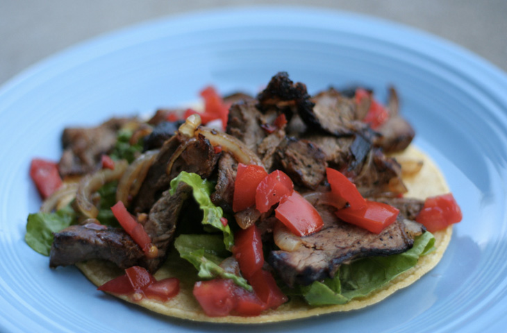 В миске смешать 3 столовые ложки соевого соуса с чесноком и имбирем. Смазать стейк маслом и дать постоять в течение 20 минут. Обжарить стейк в большой чугунной сковороде на сильном огне, около 6 минут. Дать отдохнуть 5 минут. Мясо произвольно нарезать и подавать в лепешке тортилья с зеленью и овощами по вкусу.