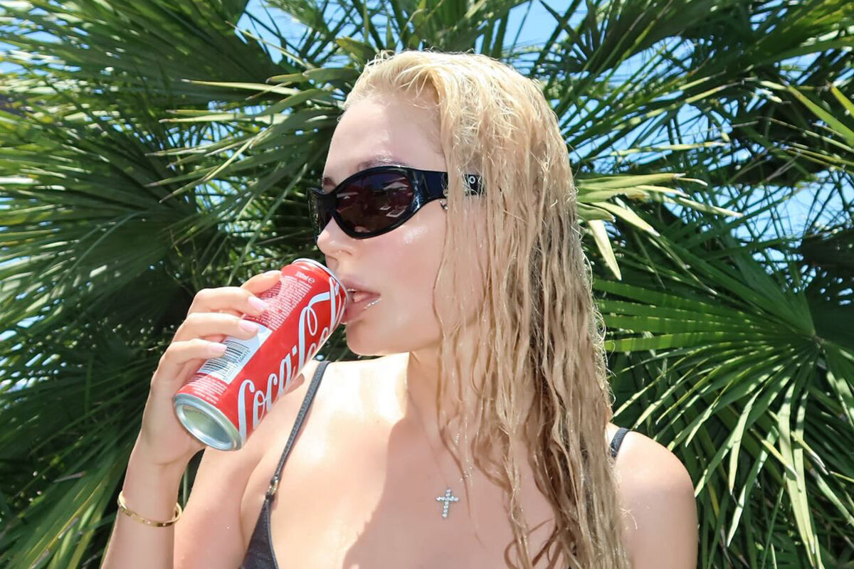 Наталья Рудова позировала в кадре в мокром черном крошенчом бикини, к которому добавила солнцезащитные очки в тон, золотой браслет и цепочку с крестом. Актриса была запечатлена с мокрыми распущенными волосами и без косметики. Знаменитость стояла на фоне пальмы и держала банку Coca Cola в руке.