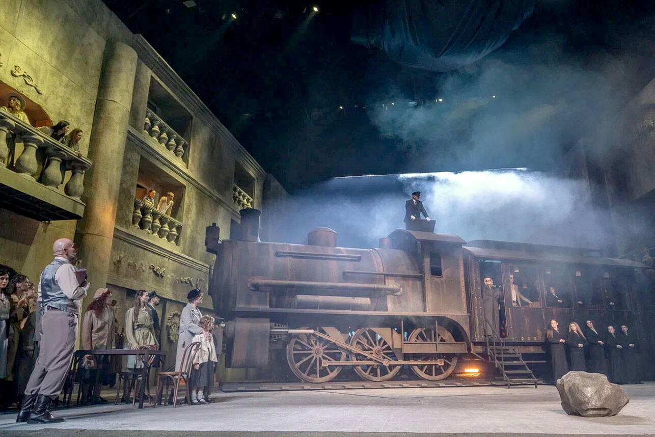 Постановка впечатляет не только блестящей актерской игрой, но и масштабной сценографией (художник-постановщик и художник по костюмам Ольга Никитина) и невероятными спецэффектами. Например, по рельсам на самой большой сцене в Европе движется огромный черный паровоз. Массивные стены города, колонны, сумрачные цвета рисуют картину города.