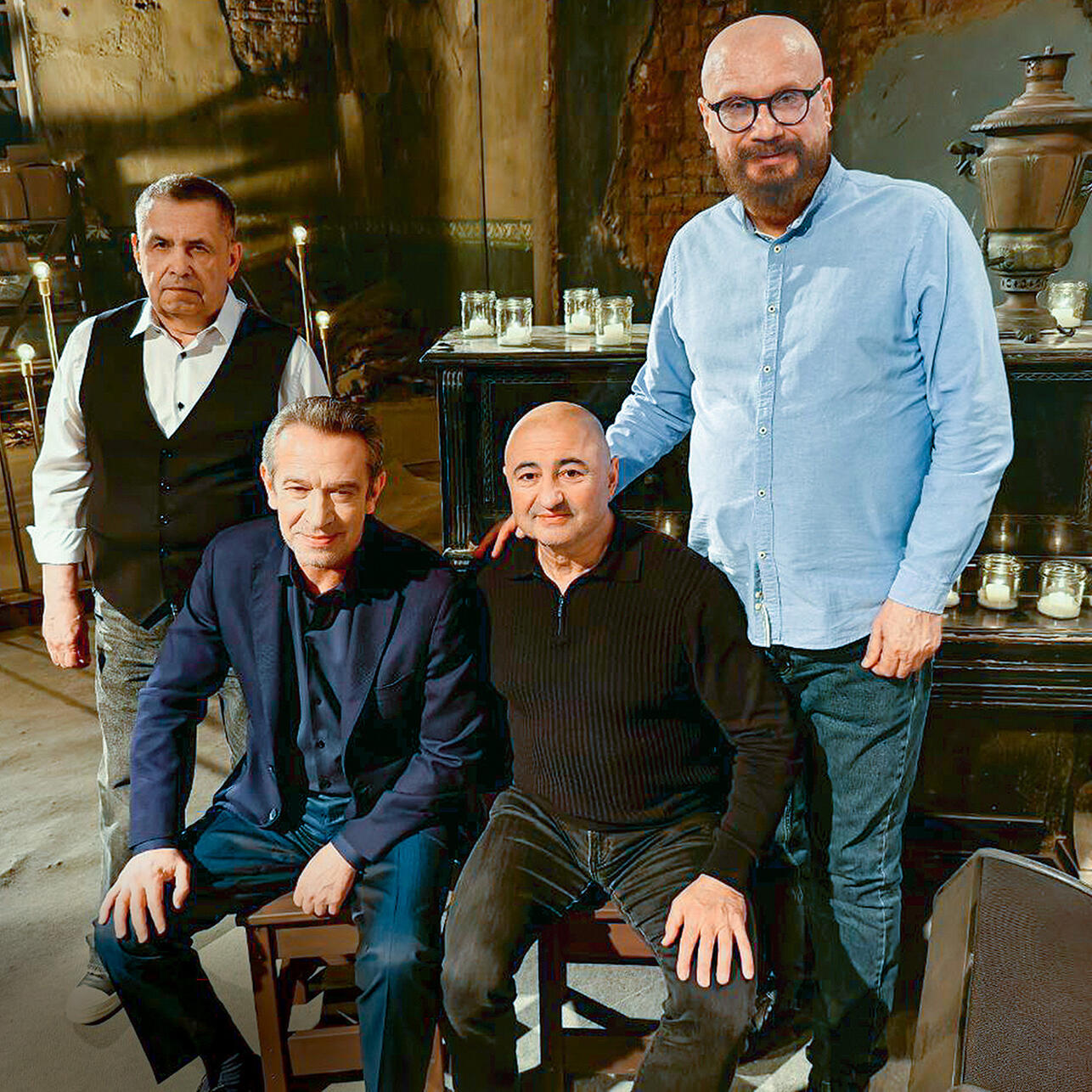 С Николаем Расторгуевым, Владимиром Машковым, композитором и сенатором Александром Вайнбергом на съемках программы «Квартирник Маргулиса». 2025 г. из личного архива Андрея Ковалева— Уже взрослым я пару раз на мотоцикле разбился, с тех пор у меня походка вразвалочку...