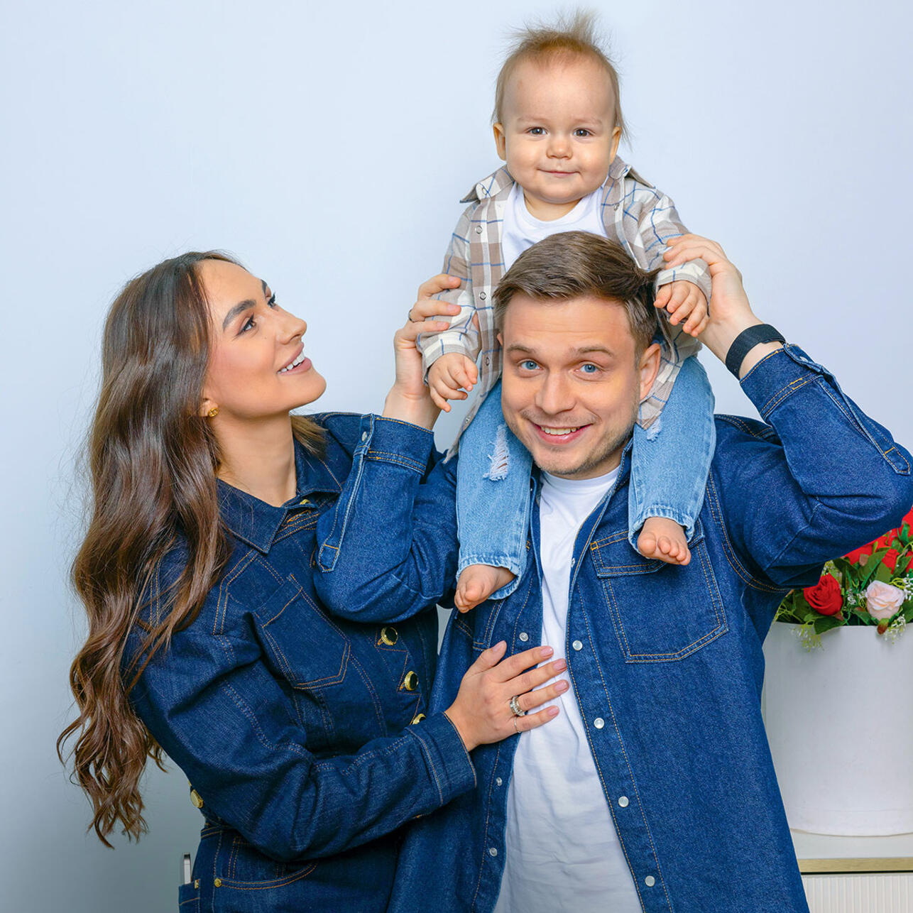 На Антоне футболка, рубашка, брюки United Colors of Benetton; на Валерии джинсы и куртка Marciano by Guess; на Леоне рубашка BabyBu Филипп Гончаров«Ребенок — центр нашей любви, но все равно мы друг у друга на первом месте. Сын пришел в нашу семью, а не наоборот. Мы встроили Леона в наш ритм: он ездит с нами в командировки, бывает за кадром на моих съемках новостного блока в «Народном фронте», также мы брали его в поездки во время выборов. Пусть с самых ранних месяцев видит нашу работу, наш путь», — говорит журналист и политический обозреватель Валерия Ткачёва в совместном интервью с мужем, депутатом Госдумы от партии «Новые люди» Антоном Ткачёвым.