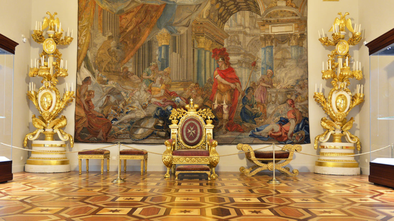 Трон и обитая малиновым бархатом подножная скамеечка на орлиных лапах являются уникальными и имеют высокую историческую и культурную значимость.