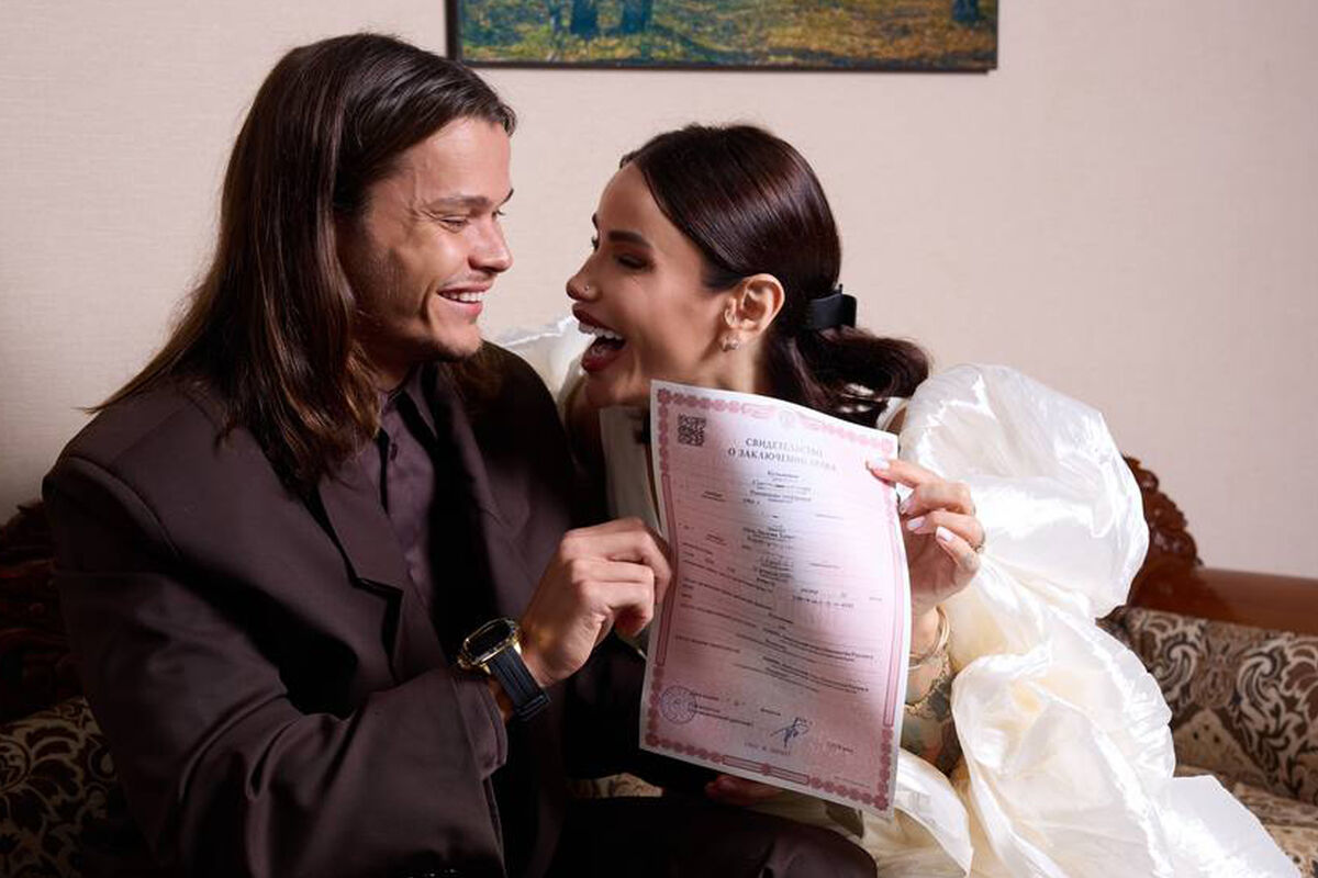 Айза поделилась кадрами со свадьбы. На снимке молодожены держат свидетельство о браке.