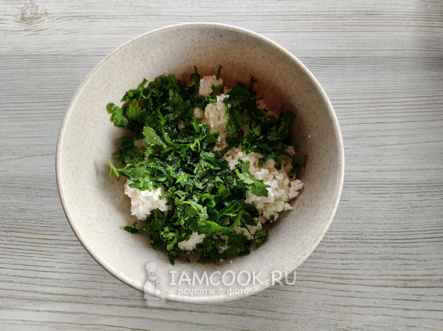 В творог добавить рубленую зелень и по вкусу соль.