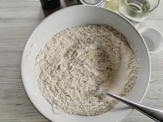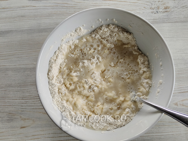 Влить смесь в муку с солью.