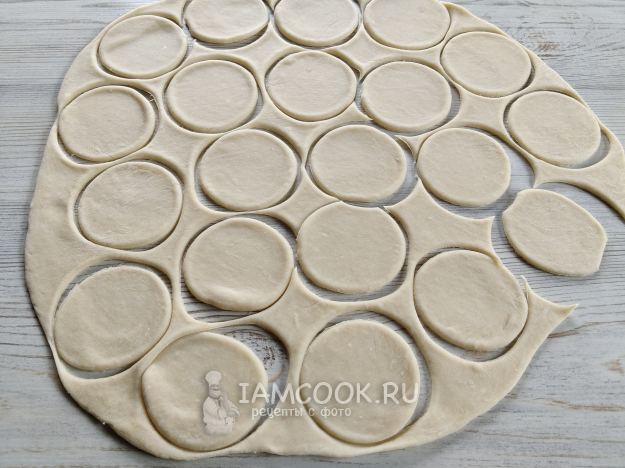 Тесто раскатать в тонкий пласт. Вырезать кружочки стаканом.