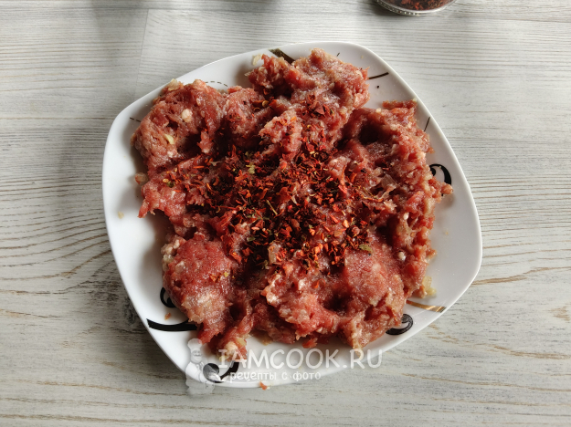Мясо перекрутить через мясорубку (можно взять уже готовый говяжий фарш). Добавить соль, перец и паприку.