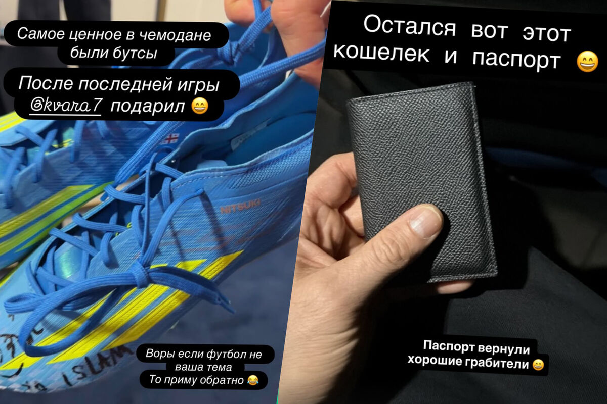 "Вот так четко я ехал в Италию, но теперь она мне не нравится. Остался кошелек и паспорт, который мне вернули хорошие грабители. Самое ценное - в чемодане были бутсы, которые мне подарил Хвича Кварацхелия после последней игры. Воры, если футбол не ваша тема, то приму обратно. Не стоит переживать. Все нормально, без паники", - написал Махачев.