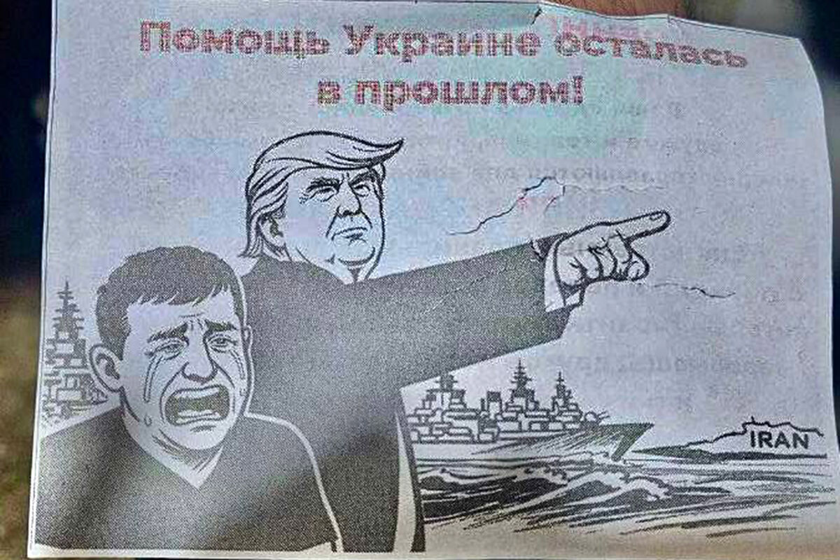 На рисунке изображен Дональд Трамп, а также плачущий мужчина, похожий на президента Украины Владимира Зеленского. Надпись на бумаге гласит: "Помощь Украине осталась в прошлом".