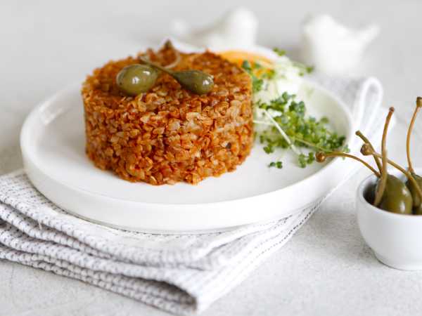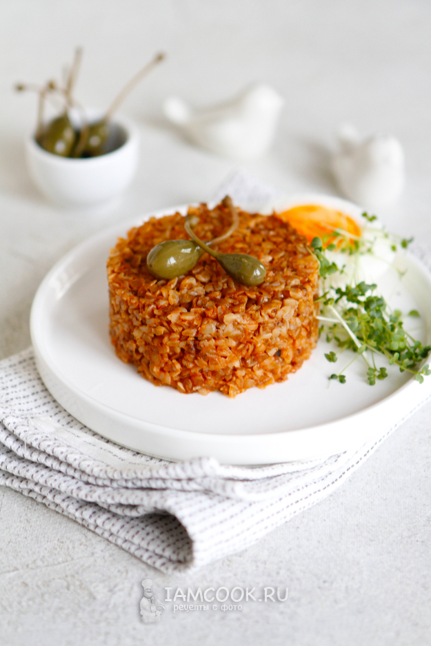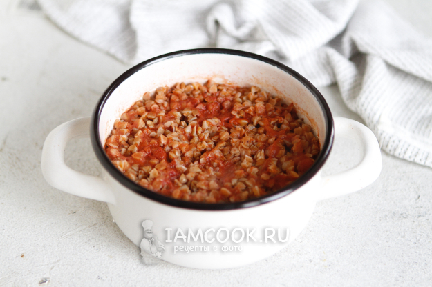 Готовую гречневую кашу в томатном соке разложите по тарелкам и подавайте к столу.