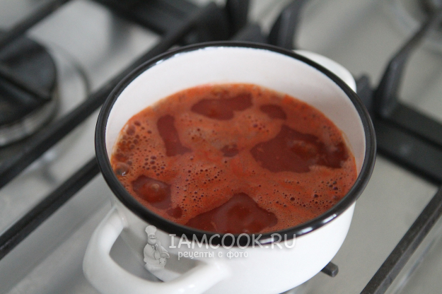 В кастрюлю влейте томатный сок, из расчета: на 100 г гречки - 200 г томатного сока. Дождитесь, когда закипит сок, убавьте огонь. Слегка посолите.