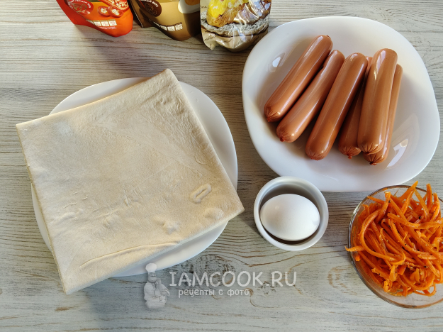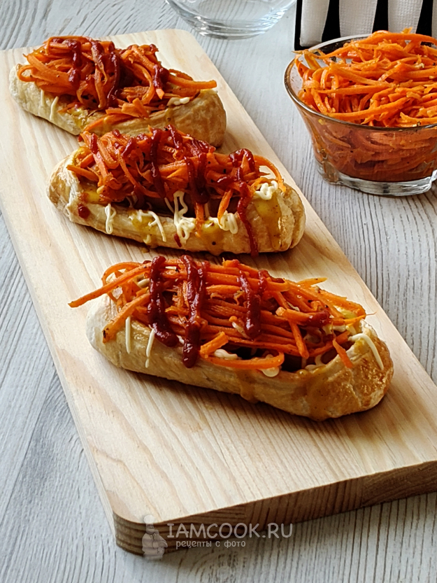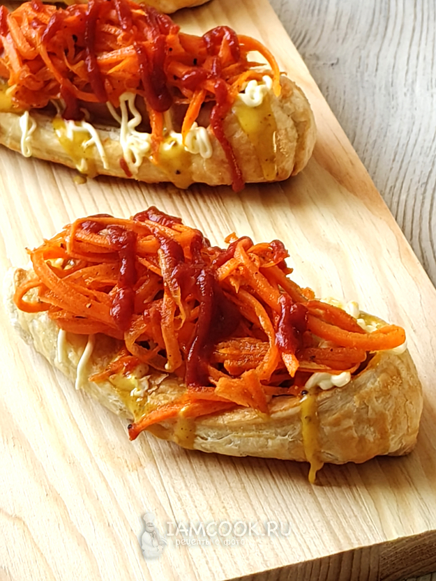 Полить хот-дог из слоеного теста соусами, выложить морковь по-корейски, как вам нравится и сколько душе угодно)).