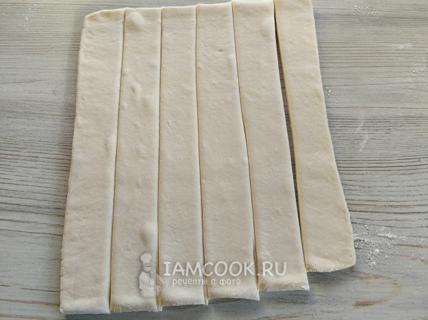 Тесто слегка раскатать. Нарезать на полоски.