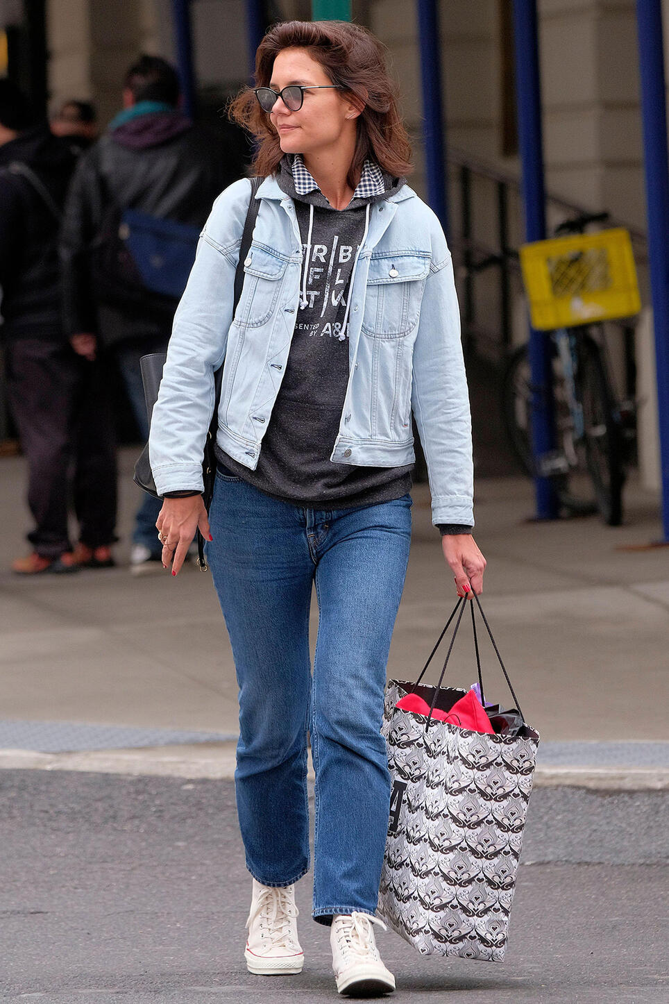 Модный многослойный кэжуал-образ как у Кети Холмс. Белые сникеры + джинсы + клетчатая рубашка+ худи + куртка из денима