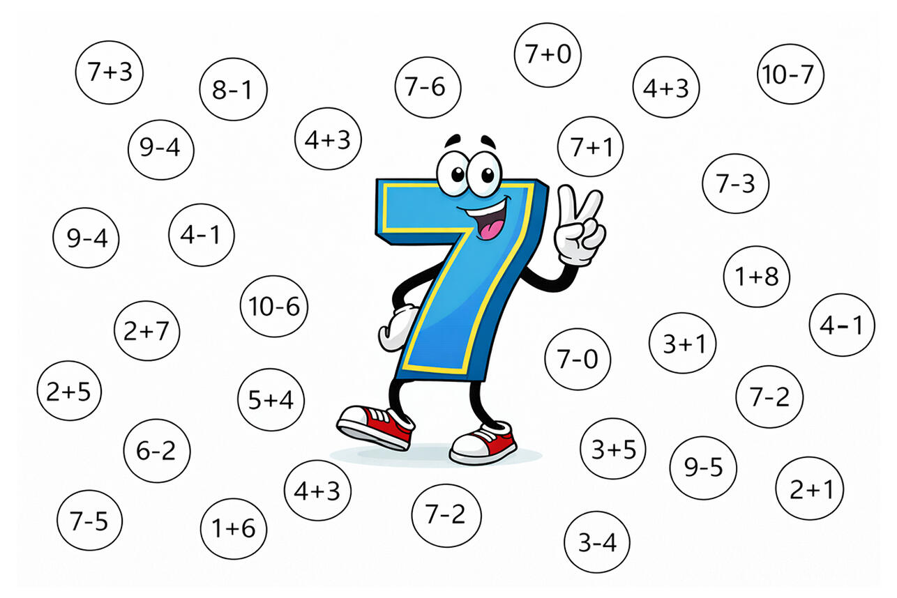 Задание представляет из себя лист, на котором вразброс написаны примеры. Перед ребенком стоит задача: внимательно посмотреть на каждый пример и обвести только те, у которых в результате получается нарисованное в центре число.