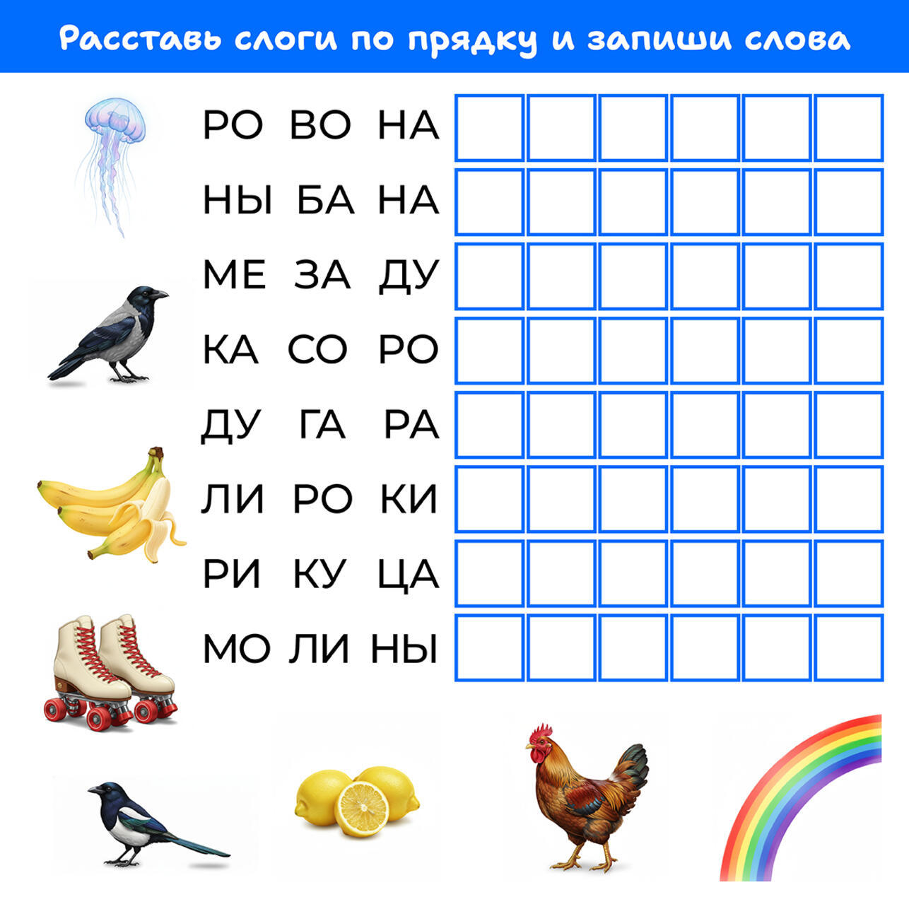 Развивающие игры дают возможность привлечь внимание ребенка и дать ему возможность познакомиться со слогами. Упражнение «Расставь слоги по порядку и запиши слова» стимулирует беглость речи и навыки чтения. А если малыш уже умеет писать буквы, то игра будет полезна еще и для развития навыков письма.