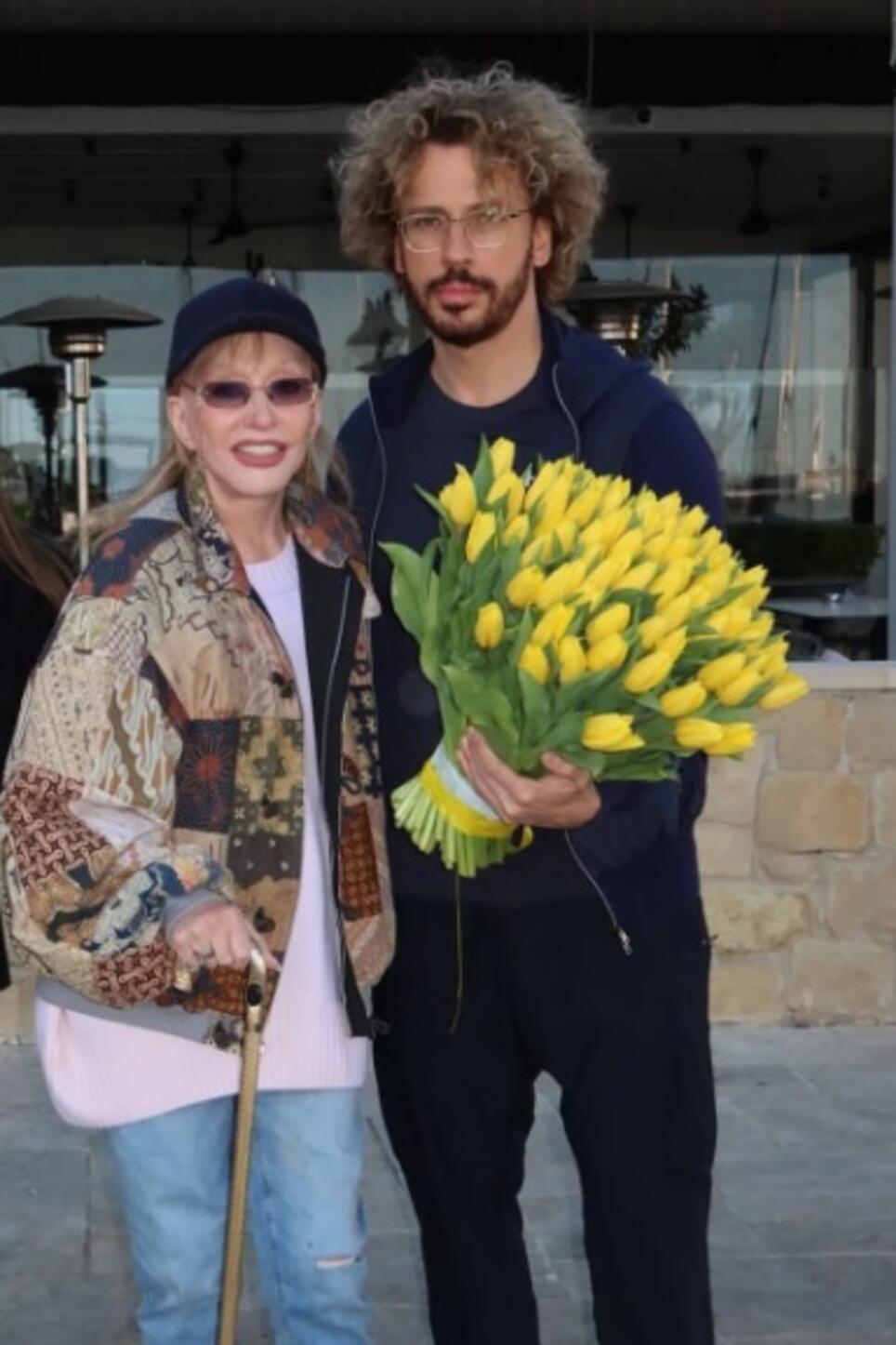 Пугачева позировала в повседневном образе: джинсах, белой футболке и куртке в стиле печворк. Образ дополняла бейсболка и солнцезащитные очки. Ее супруг предстал в лохматом виде с букетом желтых тюльпанов в руках. Супруг Аллы Борисовны в этом году пропустил весенний праздник, который его жена уже много лет отмечает в первое воскресенье марта. Однако, как видно, он исправился и все-таки поздравил любимую, хоть и с опозданием.
