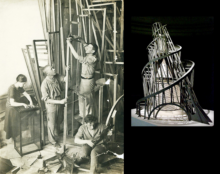 Одной из важнейших работ «великого мастерового» стал проект «Памятника III Коммунистического интернационала» (1919-1920). Гигантская конструкция (планировалось, что ее высота достигнет 400 метров) напоминала Вавилонскую башню. Нижняя, предназначенная для конференций и съездов «ступень», должна была совершать полный оборот в течение одного календарного года. В расположенной выше пирамиде намечалось разместить исполнительные органы, и эта часть конструкции оборачивалась бы за месяц. Цилиндр, где следовало разместить информационное бюро и радиостанцию, вращался, по идее, со скоростью один оборот в сутки. Наконец, полусфера в верхней части башни осуществила бы свое вращение за час.