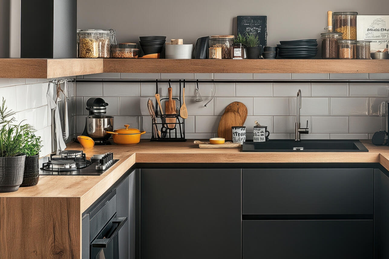 Красивый рейлинг помогает разместить кухонную утварь, а может, даже сушку для посуды. Помните? Если перешли к открытому хранению, важно все выдержать в одном стиле и соблюдать порядок.