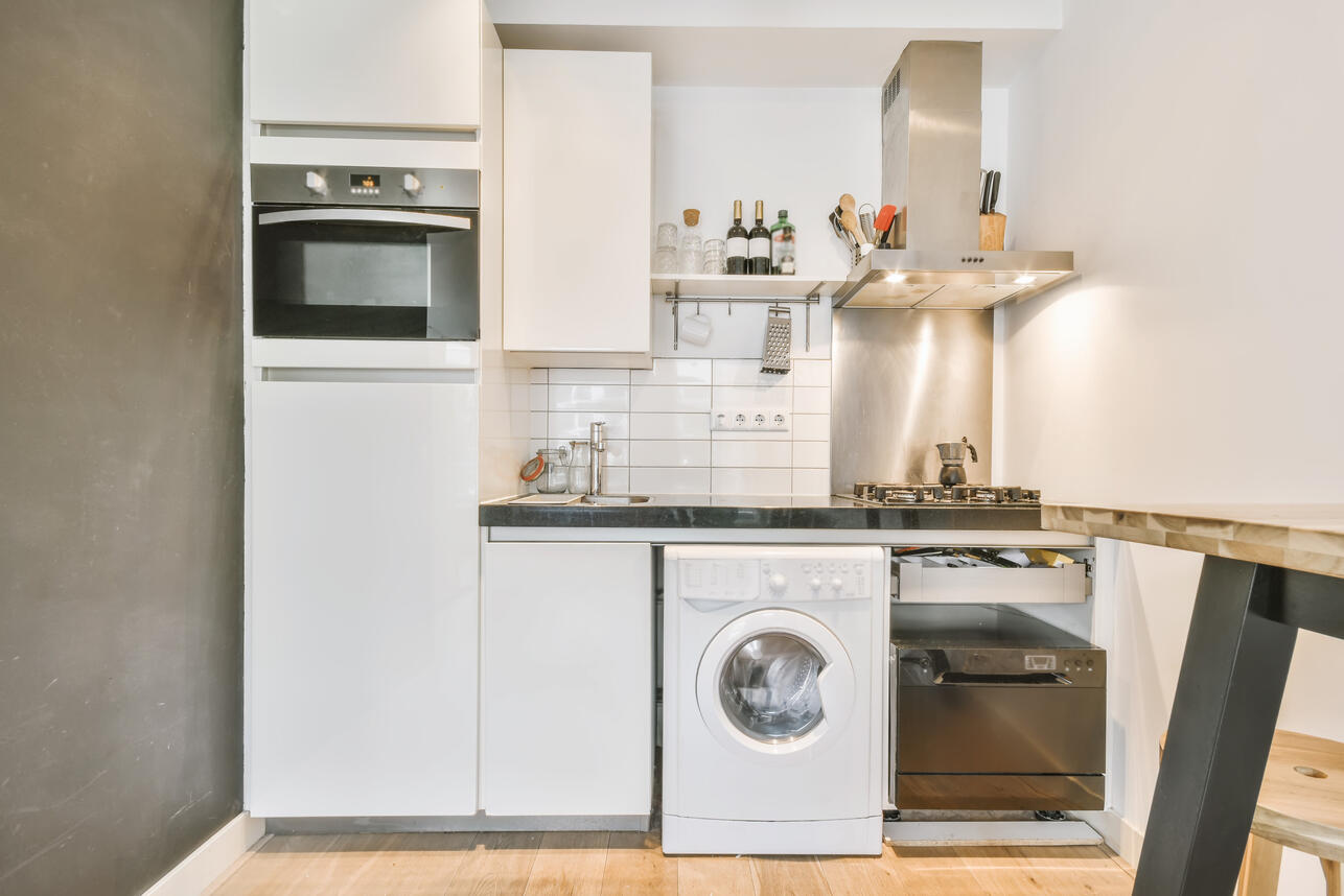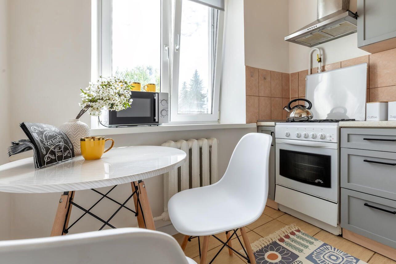 Вы также можете разместить дополнительные шкафы или полки для хранения вокруг окна или над обеденным столом. А кухню – продлить антресолями над дверью. Или рассмотреть покупку узкого шкафа-пенала и разместить его в противоположном углу кухни. Он пригодится как дополнительное место для хранения посуды или размещения СВЧ.