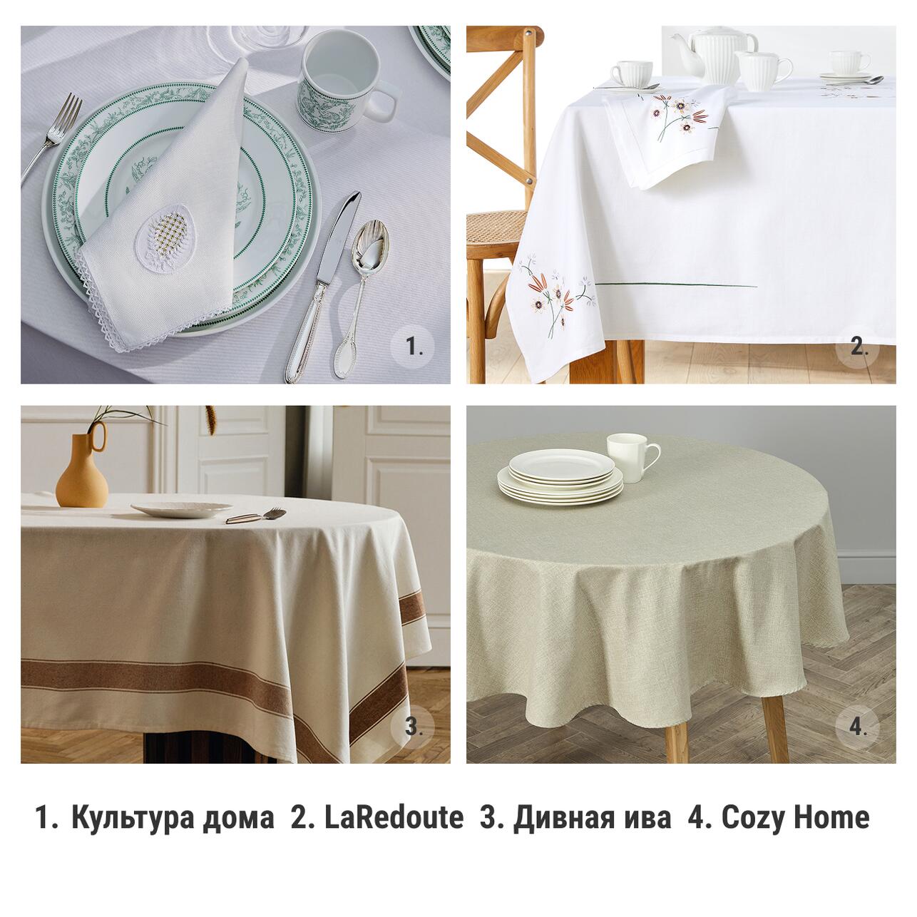 Коллаж 7Дней.ru cozyhome.ru, kuchenland.ru, togas.com/ru, tkano.ruЕсли нет нарядной, постелите однотонную (серая, белая, бежевая) и обыграйте ее деталями. Используйте льняные скатерти и салфетницы с вышивкой — они добавляют традиционности и уюта.