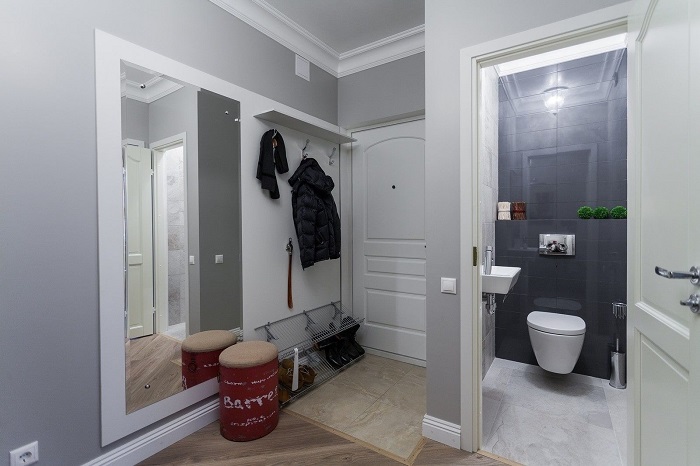 Так как прихожая не является жилой зоной, ее можно объединить с ванной комнатой. Конечно, подобная перепланировка требует согласования и изменения в техническом паспорте квартиры. Также необходимо убедиться, что у соседей снизу не расположена в коридоре жилая комната или кухня. После того, как уладите все нюансы, можно приступать к разработке проекта.