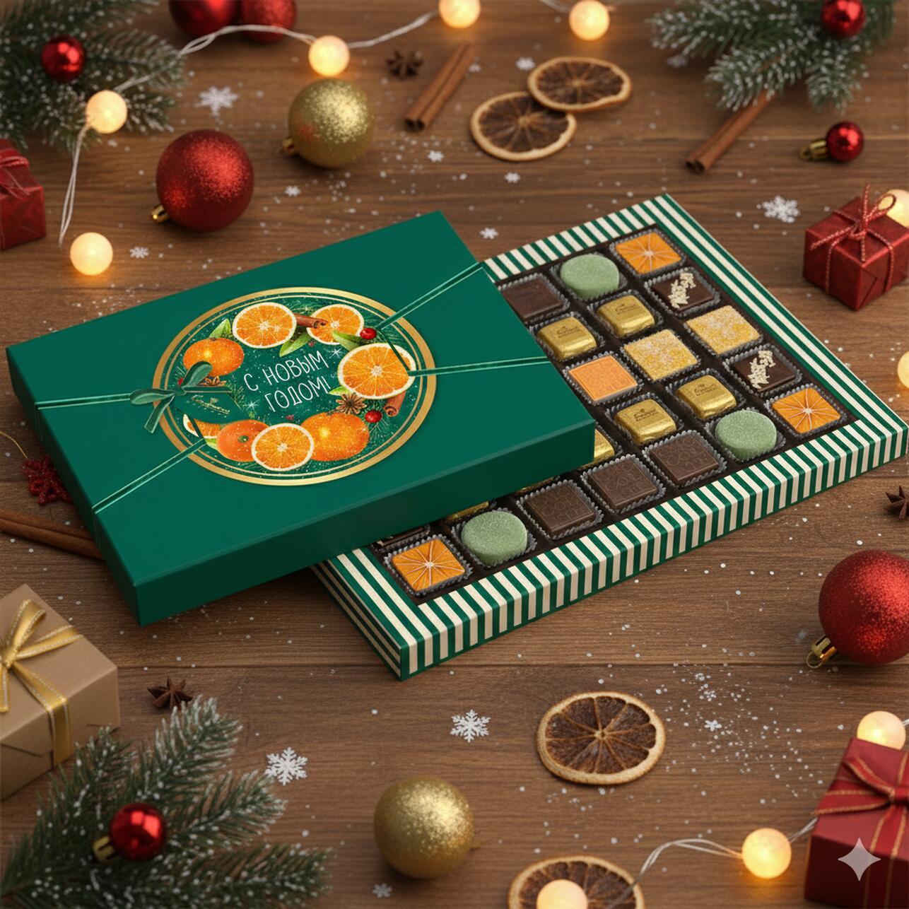 предоставлено Пресс-службойЭлегантная изумрудная коробка с графикой апельсинов задает тон всему подарку. Внутри — авторский шоколад с начинками (фисташка, манго-маракуйя, миндаль), ручной желейный мармелад и суфле. Вкусы выстроены гармонично: от ярких цитрусовых акцентов до благородной горькой ноты в финале. Идеальный формат для корпоративного или семейного презента.