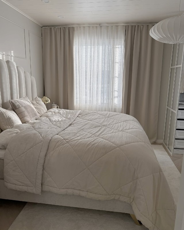 Синтетика и дешевые смеси выглядят простовато и быстро теряют вид. Если хочется, чтобы спальня выглядела дорого, экономить на качестве ткани не стоит.