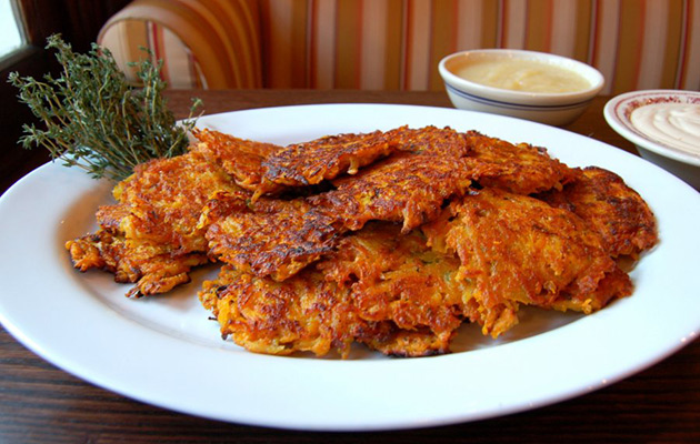 Латкес — это традиционное ханукальное блюдо. Среди историков кулинарии существует легенда, что первые латкес, поджаренные еще до нашей эры, были совсем не из картофеля, который привезли в Европу гораздо позже, а из натертого соленого сыра или из лука-порея. Сегодня же они готовятся из сырого натертого картофеля, а главная ритутальная составляющая этого еврейского блюда — чистейшее оливковое масло, на котором его жарят. Масло обязательно должно быть первого холодного отжима, и его необходимо хорошо разогреть, чтобы эти ханукальные оладьи хрустели.