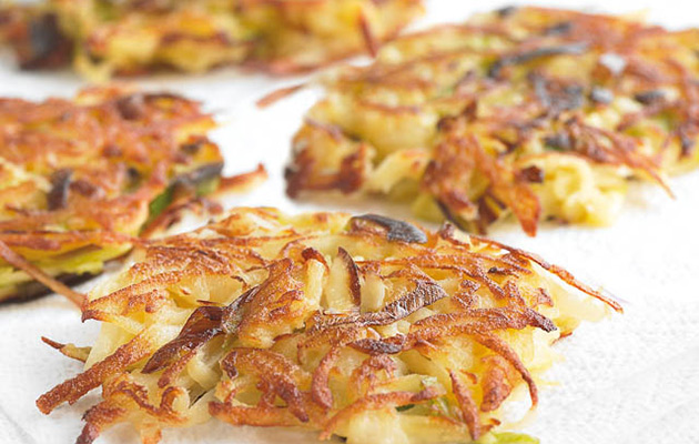 Рецепт. Сырой очищенный картофель натрите на мелкой терке и, самое главное, очень хорошо отожмите. Затем добавьте натертый лук, соль, яйца, муку (в идеале — муку из мацы) и хорошо все перемешайте. Налейте на сковороду оливковое масло и сильно его разогрейте. После этого зачерпывайте столовой ложкой приготовленную массу и выкладывайте ее в кипящее масло. Быстро обжарив одну сторону латкес до золотисто-коричневого цвета, переворачивайте на другую. Подают латкес со сметаной, йогуртом или яблочно-клюквенным соусом.