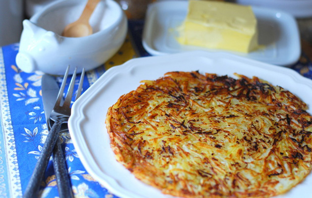 Рёшти — это швейцарские картофельные оладьи, картофель для которых трут на крупной терке, хорошо отжимают и жарят всегда без добавления муки. Как от американских хашбраунов, так и от русских драников отличаются прежде всего своей текстурой и немного методом приготовления. Рёшти прекрасно сочетаются с хрустящим беконом и яичницей.
