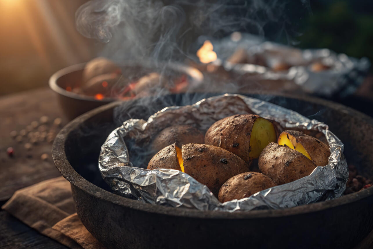 Сделайте в каждом клубне несколько глубоких крестообразных надрезов, не прорезая до конца. В разрез вложите листик травы. Сбрызните маслом, посолите и поперчите. Заверните каждый клубень плотно в два слоя фольги блестящей стороной внутрь. Закиньте в горячие угли на 25-30 минут. Готовность проверяйте зубочисткой — она должна легко протыкать картофелину. Подавайте со сметаной или растопленным сливочным маслом.