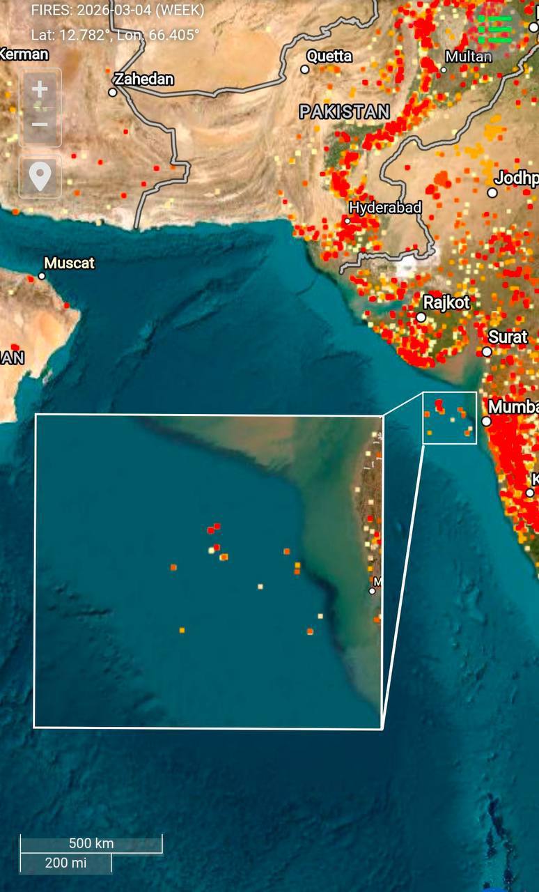 Спутниковые данные инфракрасного наблюдения NASA указывают на возможное возгорание в зоне пребывания эсминца класса Arleigh Burke у побережья Индии. Ранее Иран заявил, что произвёл ракетный обстрел американского корабля, вызвавший пожар, что подтвердилось анализом тепловых карт американского агентства, фиксирующих очаги горения.