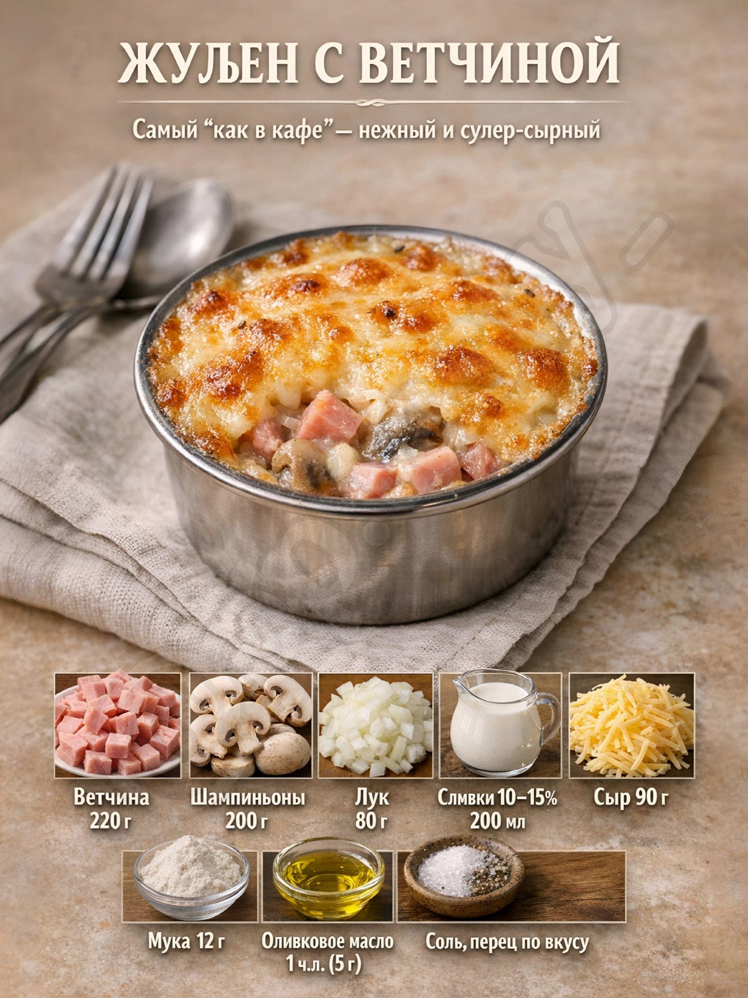 Фишка: картофель лучше заранее отварить до полуготовности — и жюльен пропечётся равномерно