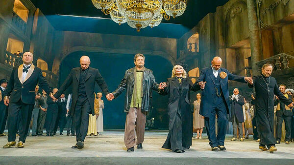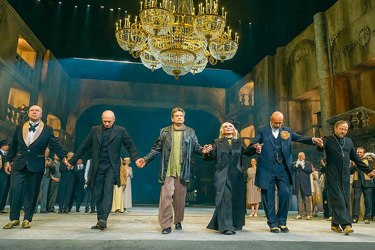 Николай Козак, Александр Домогаров, Ольга Богданова, Максим Аверин и Игорь Марченко Пресс-служба театра Российской АрмииСпектакль по пьесе Фридриха Дюрренматта «Визит старой дамы» — вторая постановка Александра Лазарева в качестве главного режиссера Театра Российской армии. А как известно, это серьезное испытание для любого творческого человека. И, судя по отзывам зрителей, Лазарев прошел его блестяще. «Предложение» — в какой-то степени продолжение разговора, начатого нами в «Романе», — комментирует Александр. — Притча о человеке и его душе, о глобальных человеческих разломах, о том, как золото и деньги побеждают человеческую душу, но есть отдельные личности, которым удается сопротивляться искушению. Хочется говорить о глобальных вещах, тем более масштаб сцены позволяет!» Постановка впечатляет не только блестящей игрой Ольги Богдановой, Александра Домогарова, Максима Аверина и других артистов, но и масштабной сценографией и невероятными спецэффектами. Например, на самой большой сцене в Европе проложили рельсы, по которым движется огромный паровоз.