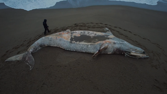 Сотрудники СахНИРО выехали на поиски. Шторм успел унести тело млекопитающего дальше по пляжу. Это оказался самец серого кита. Учёные осмотрели его и взяли пробы для исследований.