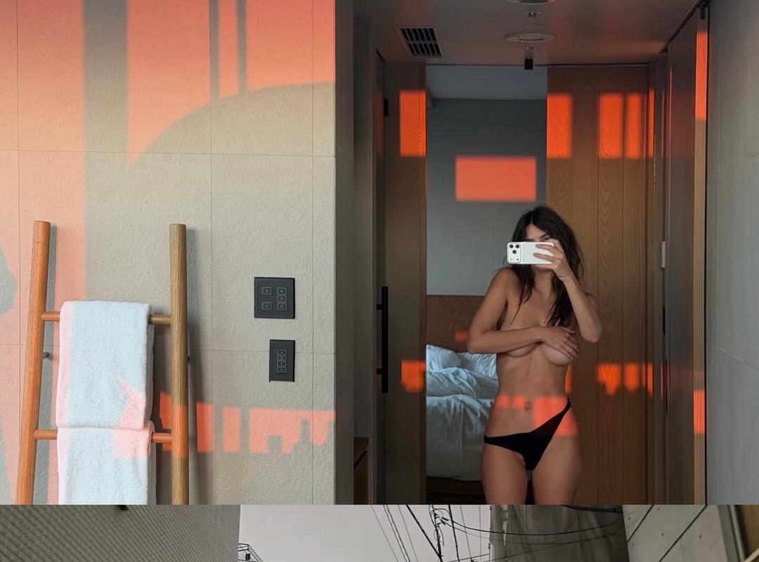 34-летняя Эмили Ратаковски показала кадры, сделанные во время ее пребывания в Токио, Япония. На одном из фото модель стояла перед зеркалом, прикрыв грудь рукой. Манекенщица предстала в черных трусах и с распущенными волосами.