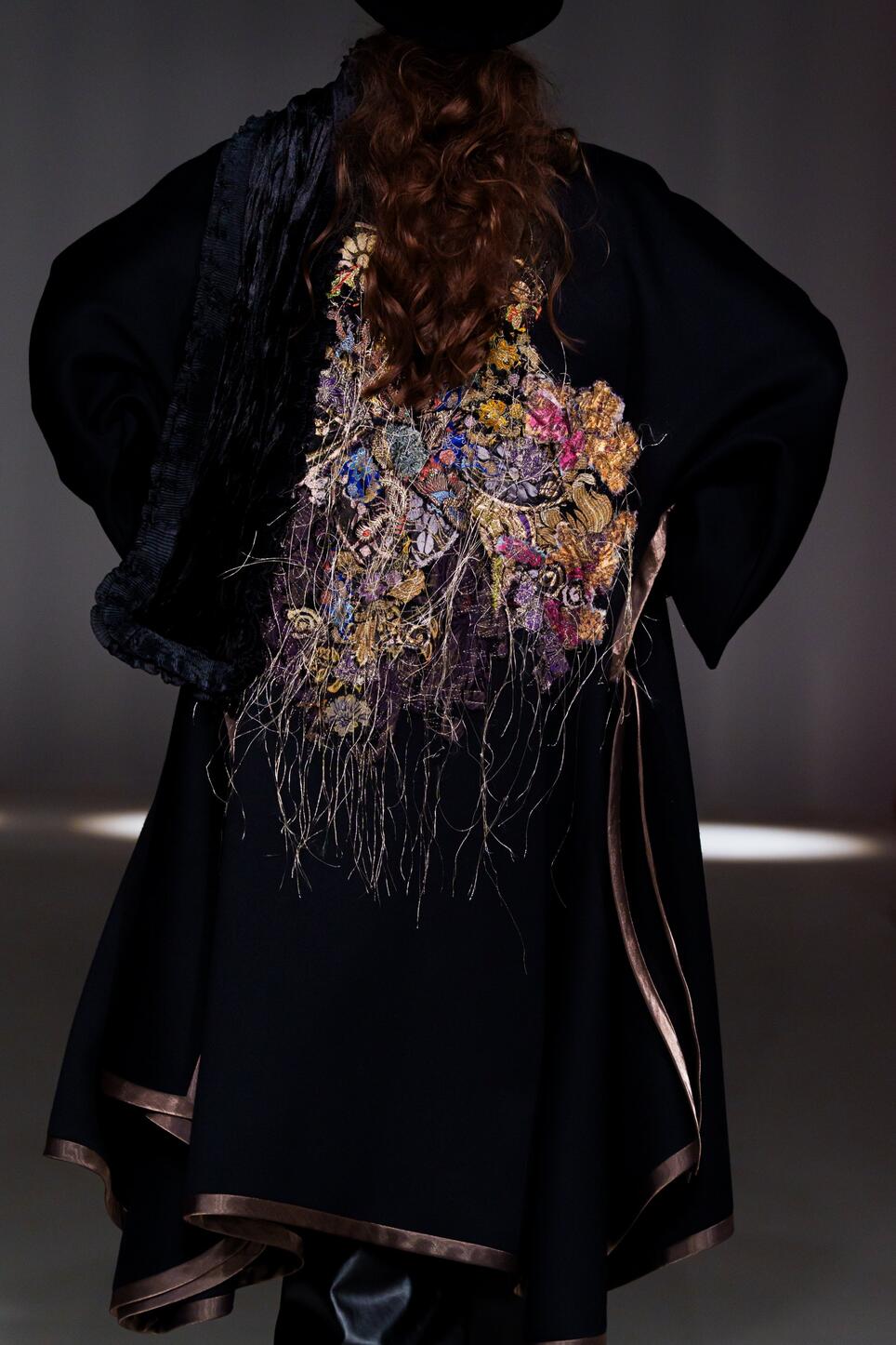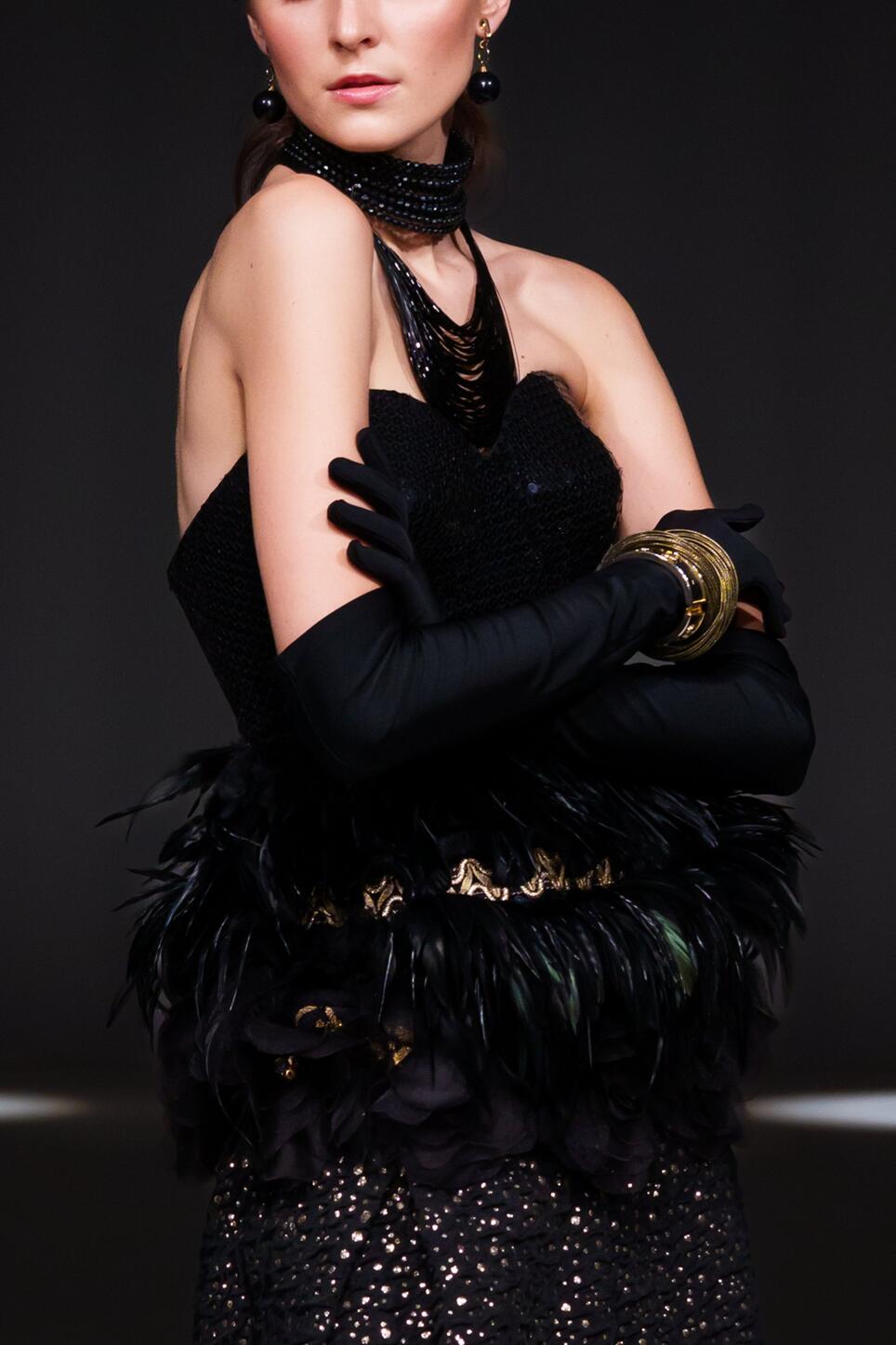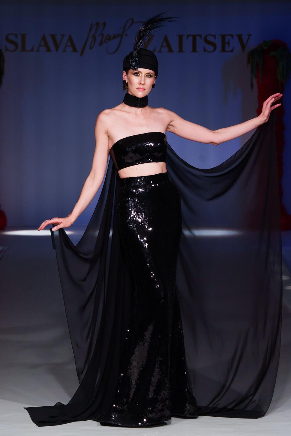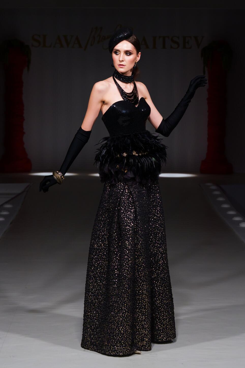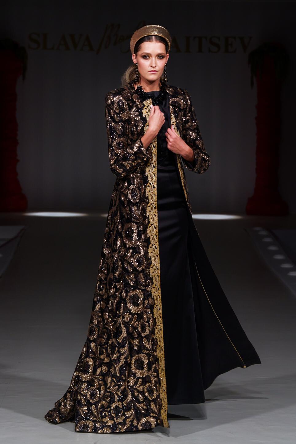 Вечер решен по-зайцевски роскошно: строгий черный в сочетании с насыщенным золотом. Прозрачность, длина макси, пайетки, ручные фактуры, ручная вышивка стеклярусом, аппликация, включение в палитру ярко-фиолетового, все ведущие тренды сезона нашли свое воплощение в изысканных образах высокой моды.