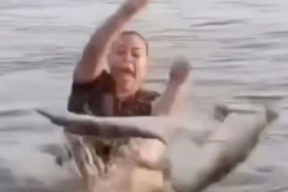 На кадрах видно, как женщина спокойно находится в воде и, судя по всему, не замечает дрейфующий рядом объект. В какой-то момент она касается предмета, похожего на бревно, после чего в панике вскрикивает.