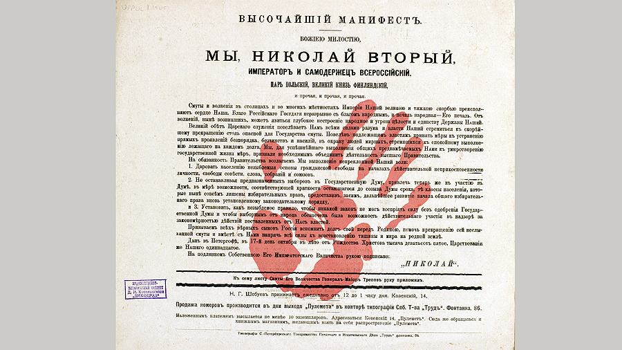 Под таким давлением государь уступил и 17 октября подписал Манифест, даровавший народу те самые «незыблемые основы гражданской свободы на началах действительной неприкосновенности личности, свободы совести, слова, собраний и союзов». Объявлялась амнистия политзаключенным, Дума получила законодательные права, и вместе с Государственным советом они превращались в двухпалатный парламент.
